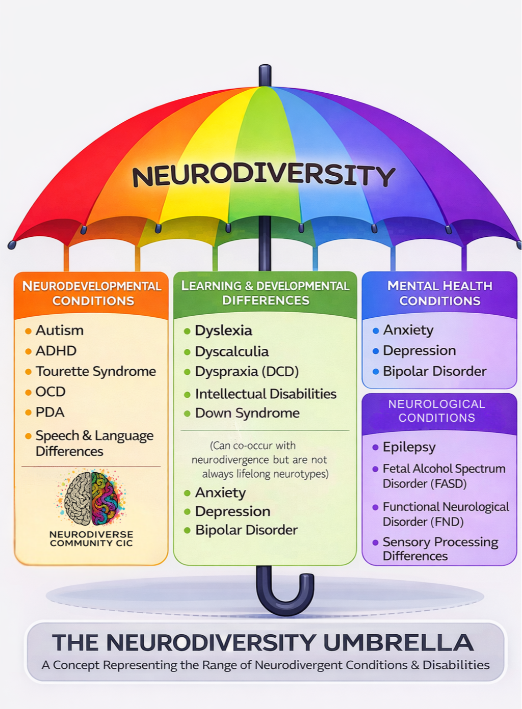 Neurodiversity is an umbrella term that describes the natural variations in how individuals' brains think and process information. Coined by sociologist Judy Singer in the late 1990s, it acknowledges that cognitive conditions such as autism, ADHD, dyslexia, and others are not deficits but rather natural differences in human brain function. This perspective promotes acceptance and understanding of these differences rather than viewing them as disorders that need to be fixed.